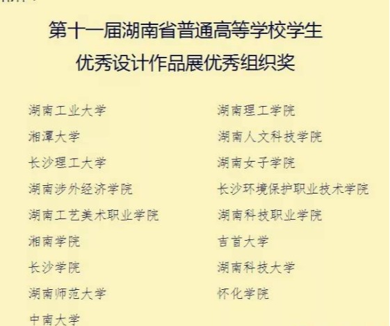12月27日,在“第十一届湖南省高校优秀设计作品展”颁奖晚会上,公司学子共获得一等奖两个(曾凡虎、周坤琳)”;二等奖六个(鄢艳、魏筱、黄励强、黄琦琼、苏曼、张敬响);三等奖七个(刘亚晨、陈剑、周颜、王楠、...
