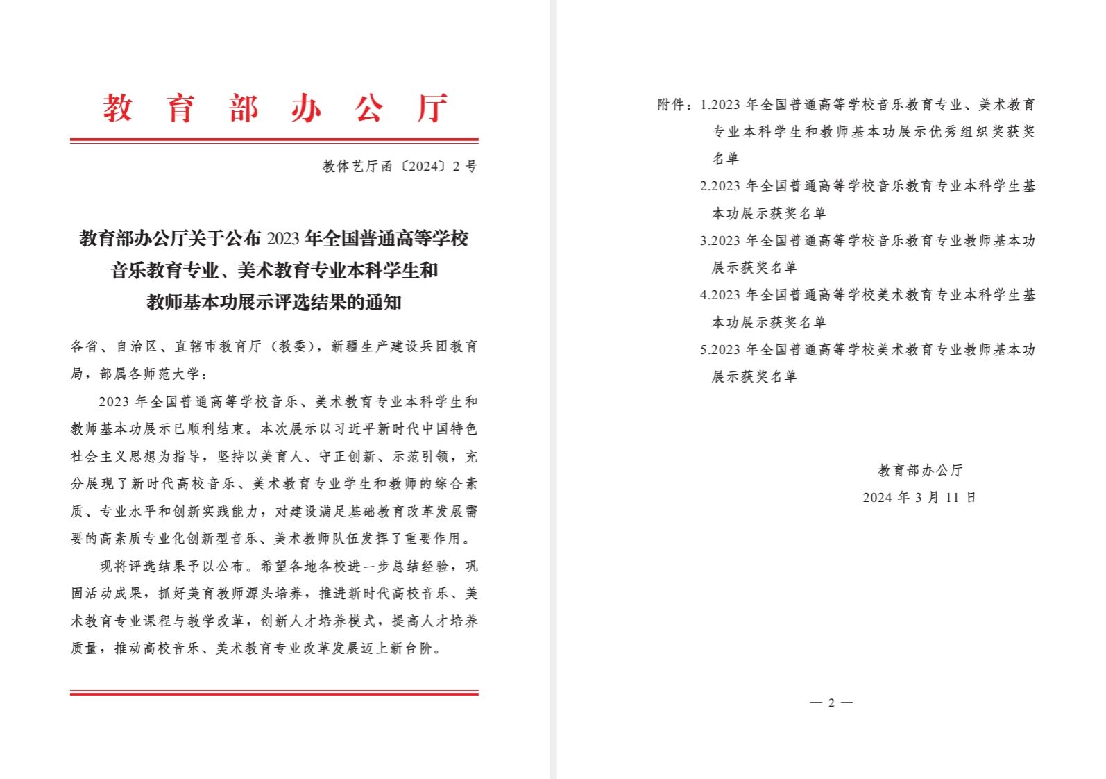 2024年2月1日,教育部公布了2023年全国普通高等公司美术教育专业本科员工和教师基本功展示评选结果,beats3655名参赛师生与来自全国各省、自治区、直辖市,新疆生产建设兵团,部属各师范大学的107所高校的346名参展师生同台展示,斩获佳绩。公司教师:王墨获个人全能一等奖,专业技能展示单项奖,审美和人文素养展示单项奖;吕道建获个人全能二等奖,审美和人文素养展示单...