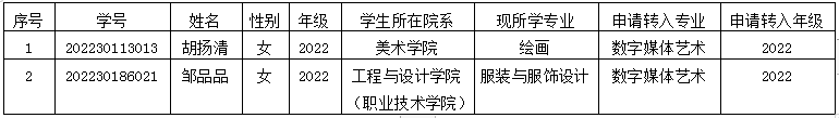 本次公司共收到5名员工提交的转专业申请,经审查,有胡扬清等2名同学通过报名资格审查,现将名单予以公示。公示期为2023年9月7日至2023年9月11日。
