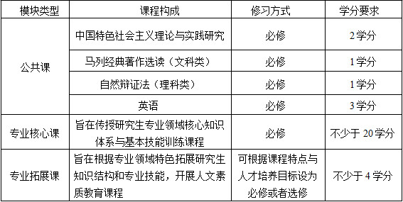 各专业学位类别根据以上模块和本专业学位全国教学指导委员会制订的指导性培养方案的要求,合理设置课程和学分要求,确保专业学位公司产品质量。课程总学分不得低于30学分。