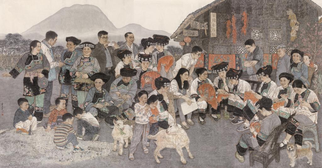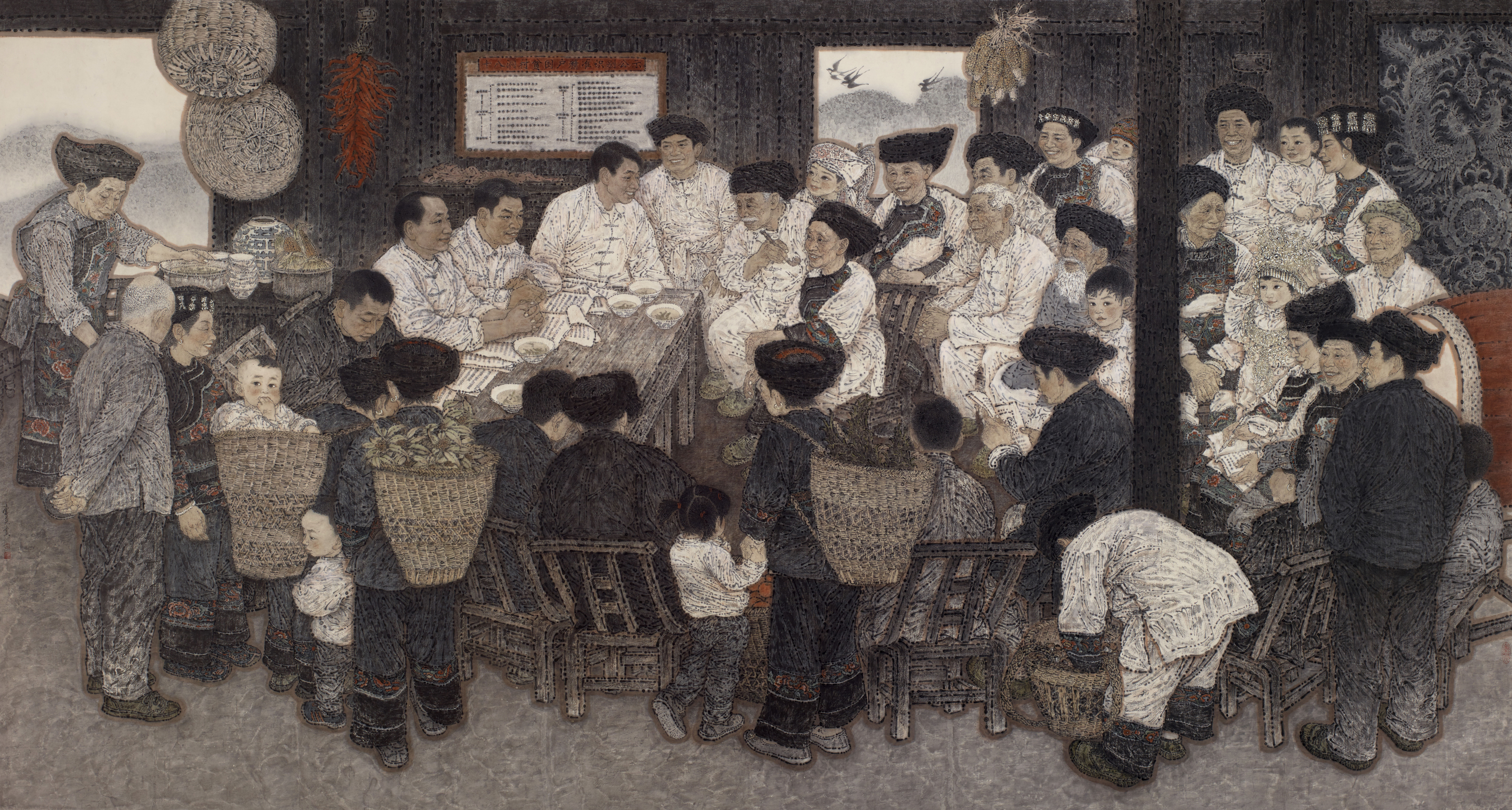 《暖心——十八洞村贫困户精准识别公示会》 中国画 240x450cm 纸本水墨 2019年 中国美术馆藏 王奋英