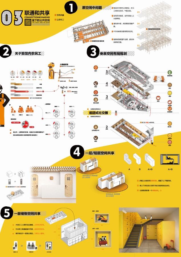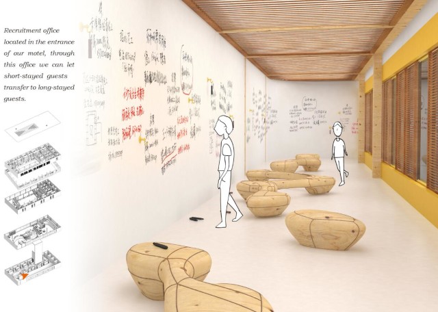 易奕说:“住在旅馆的人都是找工作的人,所以信息对他们来讲是非常重要的。他们现在都是靠站在街边等待,而且他们也并不擅长使用网络等通讯设备,设计师就是希望联动每一个工人身上的信息,进而进行信息交换,提高找工作的效率。”在这样的情况下,团队在旅馆中设计了一个交换信息的空间,任何工人有信息都可以写在白板上,这样大家接触聊天多,信息交换的可能性就更大。