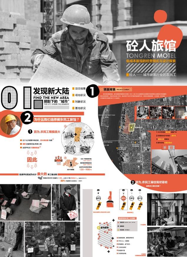 跨过店面与资金的坎儿后,设计开始。团队搜集资料,查看现场,与工人们交谈,询问他们的需求。睡觉与找工作是住客们的最大需求,能够满足这些,才能让砼人旅馆成为一个好设计。