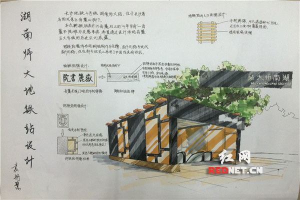 (湖南师大beats365员工自发手绘公司地铁出入口设计图,畅想师大未来新景色。此图参照了岳麓书院的风格,让市民能感受到中国传统的书院气息。作者:袁衍慧)