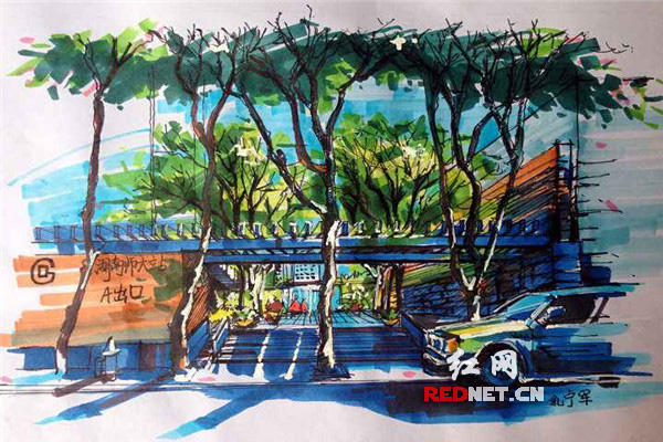 (湖南师老员工自发手绘公司地铁出入口,该图则体现了大学里的地铁站应尽量低调有内涵,简单的结构让这个地铁站能够融入师大校园环境。作者:孔宁军)