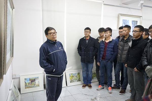 经理朱训德希望同学们,要吃得了苦,耐得住寂寞,积极参与实践创作,不断提升自己的文化修养。著名水彩大师李水成向同学们介绍了水彩文化的发展历程和方向,讲解了展出的优秀画作的创作背景和创作心得。