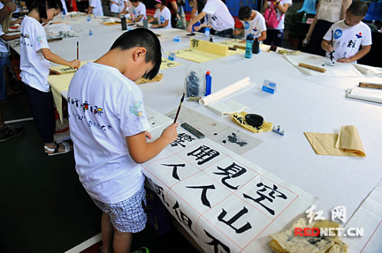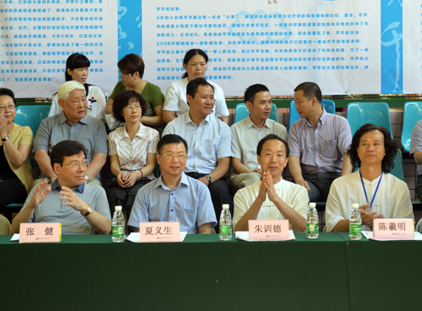 在湖南省儿童医院曙光文体馆,100位通过初赛海选顺利晋级决赛的小选手们,站在各自的案台前,或点墨挥毫,或勾描剪影,或填色涂画,进行即兴现场创作。朱训德与担任评审的各位著名书画艺术家走到孩子们身边,饶有兴趣地巡视着孩子们的作品,不时露出赞许的笑容。