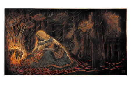 朱训德:在我看来,我不同时期的作品风格是非常不同的。早年的一些作品,如《春花集锦》《暮光》《山月无声》《春兆》《冬语》《晚炊》《洞庭吟》《朝天辣》等,都是抒情清新的风格,以表达人生为主。而近来的作品,如《中国年》系列,则致力于探索新的材料新的题材,将中国的绘画传统理念与西方的表现方式相结合,强化并融合“线”与“彩”,直接以色造线,从而刻画出粗犷飘逸的造型。其中更采用了我自制的绘画材料——岩彩,它是用山上的石头磨成的,这种材料的颜色千年不变,色彩浑厚而璀璨。