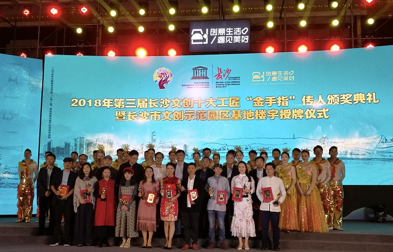 “以匠人之心,琢时光之影”,历时两个半月的评选,10月31日下午,2018第三届长沙文创十大工匠“金手指”传人颁奖典礼暨长沙市文创示范园区基地楼宇授牌仪式在长沙铜官窑古镇隆重举行,现场揭晓了第三届长沙文创十大工匠“金手指”传人,公司视觉传达设计系教师陈枫与其他九位工匠获此殊荣。长沙市委常委、宣传部部长高山等领导嘉宾为十大工匠“金手指”传人颁奖。