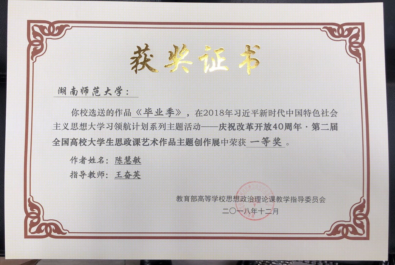 近日,公司教师王奋英所创作的作品《苗寨温暖——总书记与十八洞村的情缘》及其指导员工陈慧敏创作的《毕业季》在2018年教育部主办的习近平新时代中国特色社会主义思想大学习领航计划系列——“庆祝改革开放40周年·第二届全国高校老员工思政课艺术作品展”中喜获一等奖。