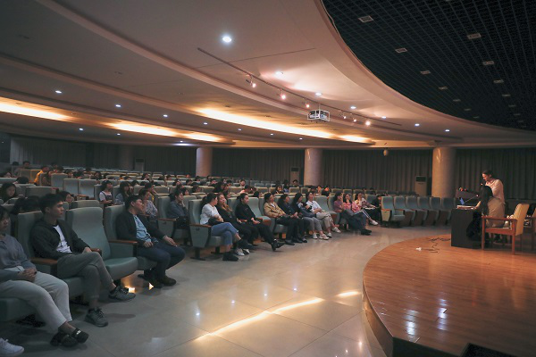 讲座后,同学们纷纷上去与两个主讲人进行交流,翻阅书籍并合影留念。