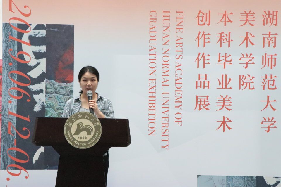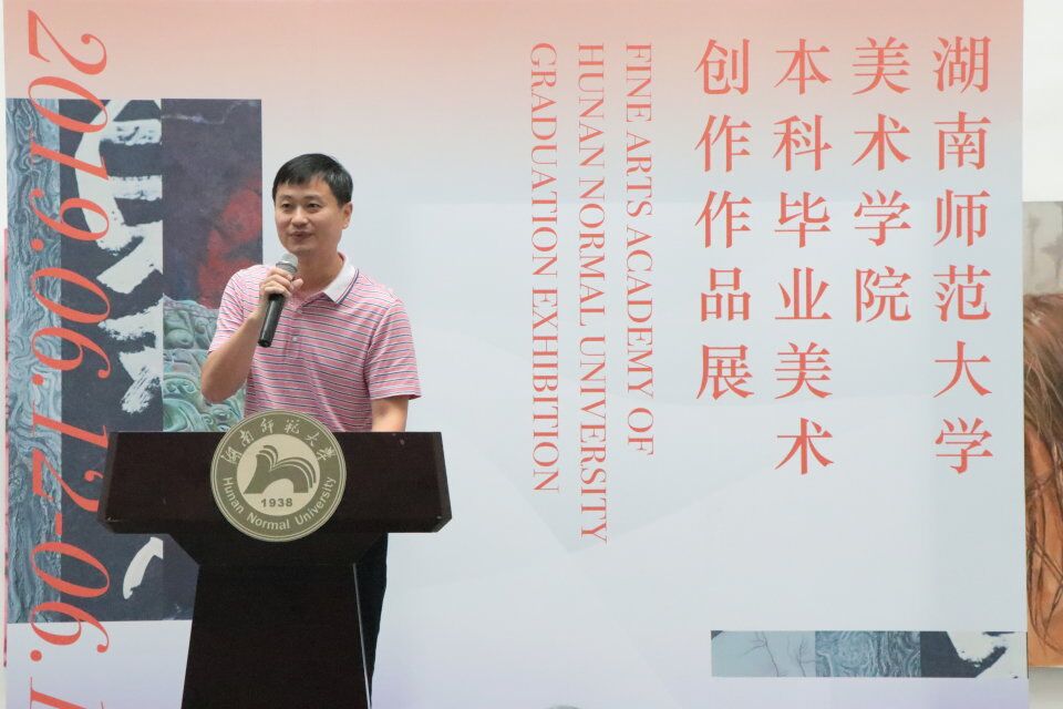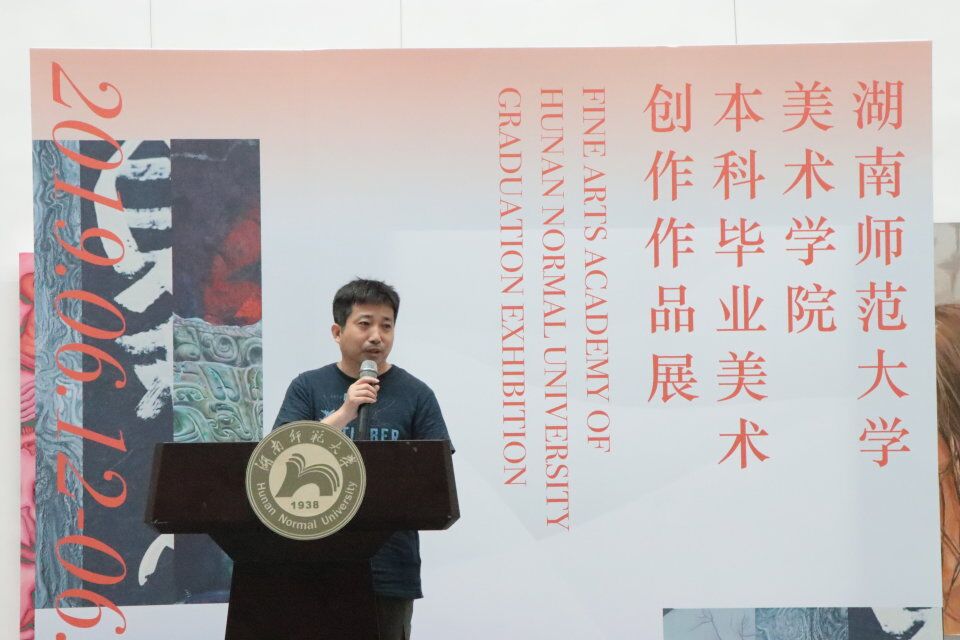 教师代表石明祥提到自己见证了同学们苦尽甘来的心路历程,表示自己的严格要求是对同学们的重视和信任,此次毕业展上同学们的作品的呈现就是对努力过程最好的证明。他讲到关于艺术本质的表现,肯定了同学们作品中体现出的情感、审美。最后他祝福同学们前途辉煌,未来美满。