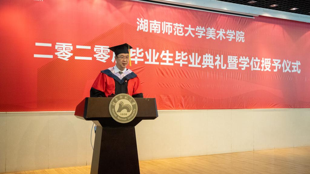 经理李少波致辞,他对毕业生送上祝福,向老师们的付出表示感谢。他指出今年的毕业季注定特殊,面对当今疫情的爆发、环境污染、社会问题等复杂变化的世界,同学们应该得到更多艺术的思考,在变革中找到自己的位置,发挥自己的作用。他希望同学们带着在美院的收获,在未来创造出更多真实的、善良的、美好的作品