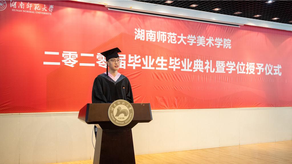 李金泽作为毕业生代表发言。他回忆自己从入学军训到如今毕业的求学时光,感恩母校的教育与老师的指导。他表示美院带给他的不只是艺术的熏陶,还有真善美的世界观的追求,并代表全体毕业生祝愿beats365的建设能够取得更加丰硕的成果,未来愈办愈好。