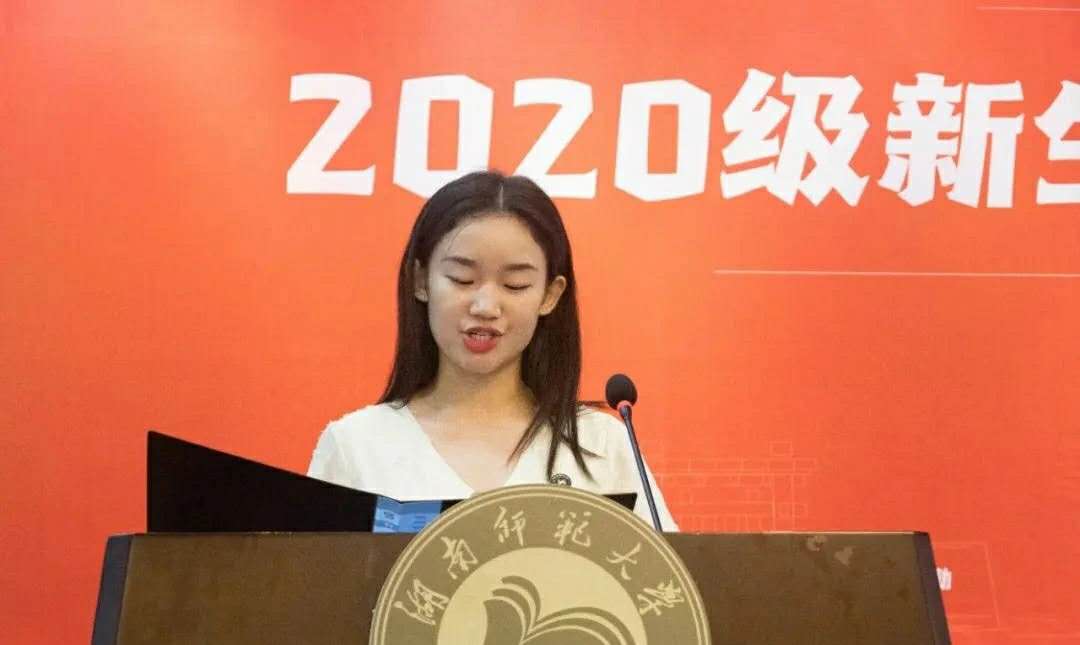 研究生新生代表胡苗苗发言,她回顾了本科四年在师大的学习生活,对老师们的悉心指导表示感谢,她表示在研究生这个新起点上,她会找准目标,制定计划,锲而不舍,同时也会培养自主学习,独立思考的习惯。