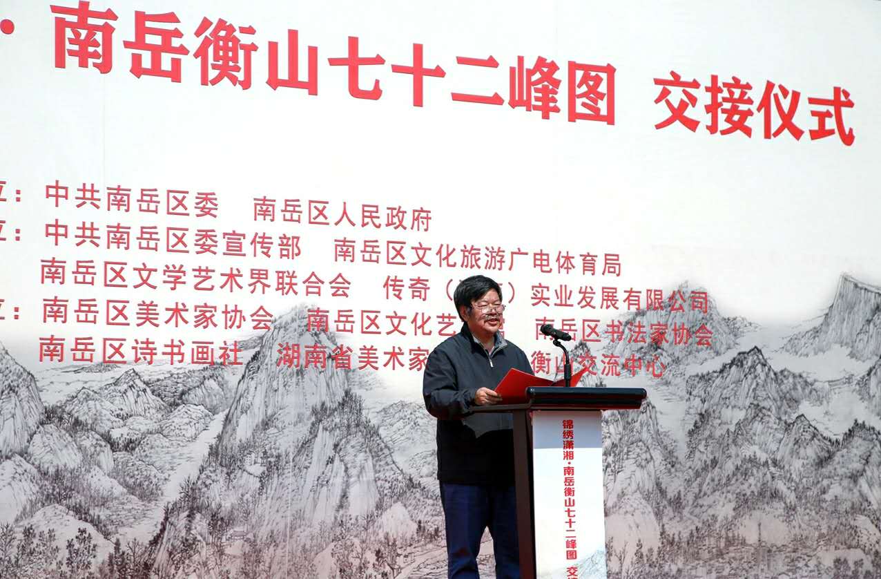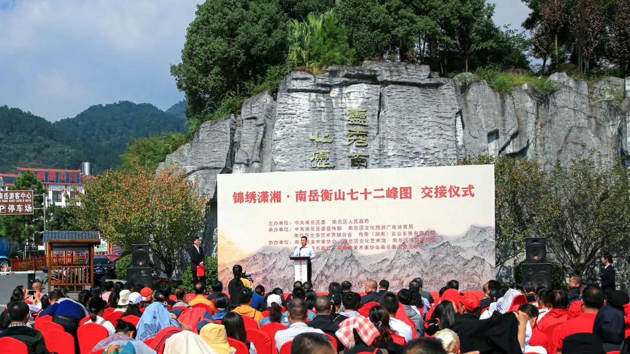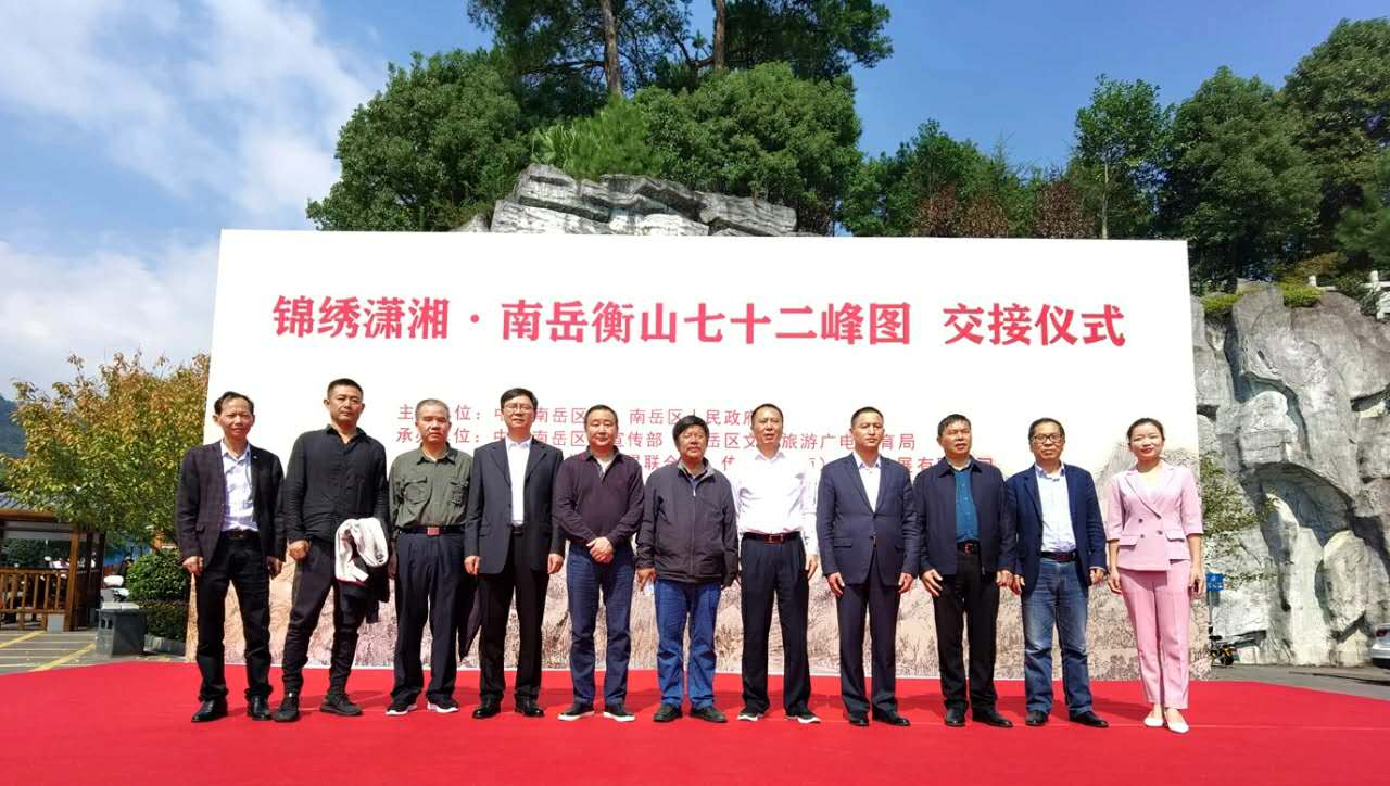 秀美南岳,圆梦金秋。10月11日,南岳区游客服务中心西坪气氛喜庆而热烈,由公司教师王金石、石纲、石劲松等主创的作品《锦绣潇湘·南岳衡山七十二峰图》交接仪式在这里举行。中共南岳区委,南岳区人民政府、市民游客等见证了这一历史时刻。