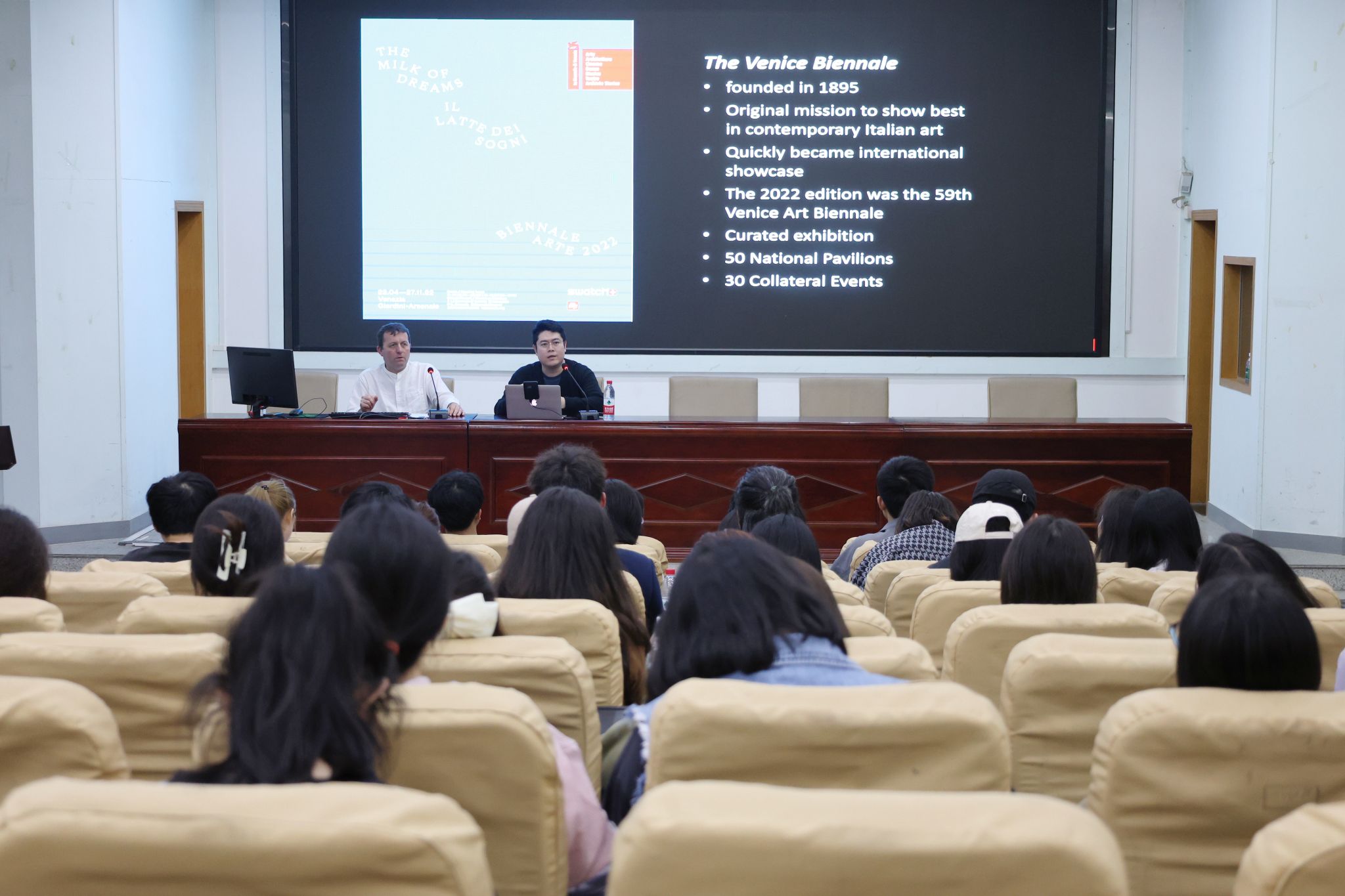 柯林·罗德教授介绍了威尼斯双年展的历史发展脉络,让同学们对威尼斯双年展有了初步的认识。历届双年展都采用一个主题去囊括艺术品,让观展者更加了解其内涵与主题中的联系。本届THE MILK DREAMS梦之乳的所表达的是身体的表现及其蜕变、个人与技术之间的关系和身体与地球之间的联系三主题。