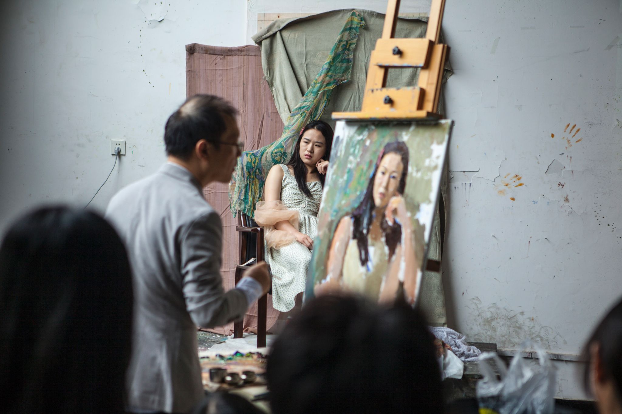 在作画前一天,贺羽教授先是用大半天时间到现场准备。从模特的选定到动作与光线的设计,从服装衬布的选择到整个画面效果的构思,再加上工具材料方面的细致准备,每一个环节都体现出中央美院在写实油画方面的严谨学风与厚重积累。在随后两个上午的写生中,他用活泼鲜明的笔法展示了一幅油画肖像从起稿到完成的全过程。画面感受细致到位,色调沉稳含蓄。写生过程直观而生动地展示了写实绘画的基础规律与油画语言的美学特性,现场的师生们都受益匪浅。通过这一次观摩,同学们对油画语言有了更深层的感受和领悟,对写实绘画也有了新的认知。