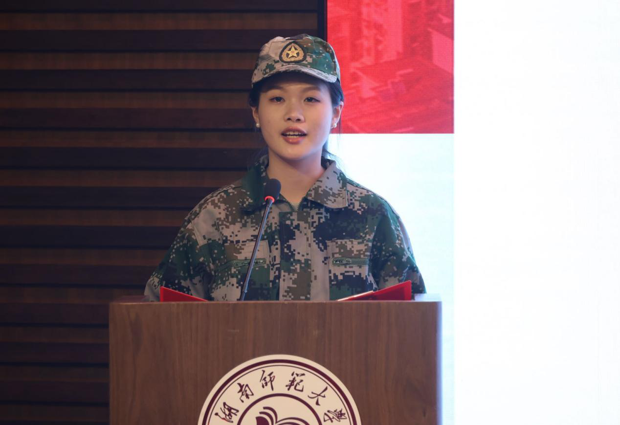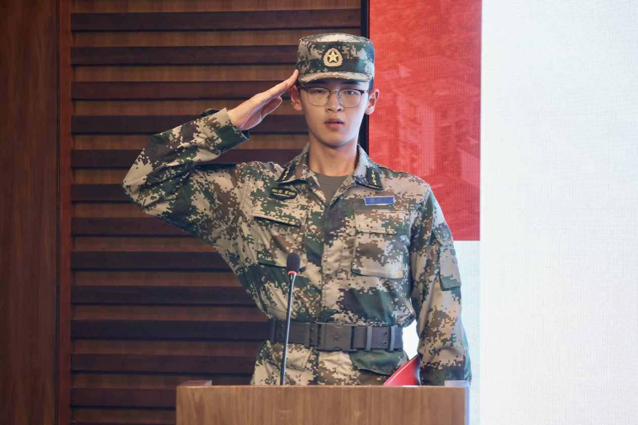 教官郑楚焓代表全体军训教官发表决心,坚持教官带头以上率下,做到言传身教,以身作则;严格按纲施训,从严治训;坚持刻苦训练,科学训练,符合循序渐进,全面提升身心素质。锤炼钢铁意志,培养坚韧品格,坚决完成新时代赋予同学们的军训任务。