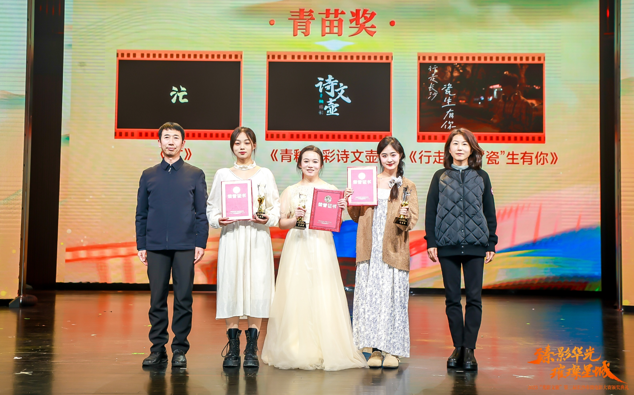 臻影华光,璀璨星城。12月15日下午,“光影文旅”第二届长沙市微电影大赛颁奖典礼在华谊兄弟电影小镇举行,湖南省委宣传部副部长、省电影局局长任晓山,省委宣传部电影处处长欧阳文风,长沙市委宣传部副部长王志勇等领导出席。此次微电影大赛以“光影文旅”为主题,共有12部作品分获一二三等奖、优秀作品奖和青苗奖。公司数字媒体艺术系2020级葛梦琳同学,导演并主演的影片《汒》荣获高校赛道“青苗奖”第一名。公司中外办学专业以及数字媒体专业本硕员工的影片《归湘》、《追光》、《60分贝》、《最是长沙青蓝色》、《山行》、《绣中溢湘》、《趣梦》等,还荣获湘江新区(岳麓区)和开福区“光影文旅”区赛不同奖项共计19项,所获奖金总金额加起来近8万元。