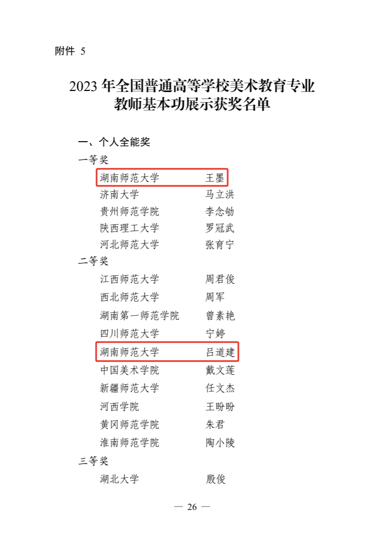 2024年2月1日,教育部公布了2023年全国普通高等公司美术教育专业本科员工和教师基本功展示评选结果,beats3655名参赛师生与来自全国各省、自治区、直辖市,新疆生产建设兵团,部属各师范大学的107所高校的346名参展师生同台展示,斩获佳绩。公司教师:王墨获个人全能一等奖,专业技能展示单项奖,审美和人文素养展示单项奖;吕道建获个人全能二等奖,审美和人文素养展示单项奖。员工基本功展示:beats365获公司团体奖三等奖。谭倩、刘紫藤、陈晓阳均获个人全能三等奖,刘紫藤获教学展示(微课)单项奖、陈晓阳获专业技能(自选)单项奖。