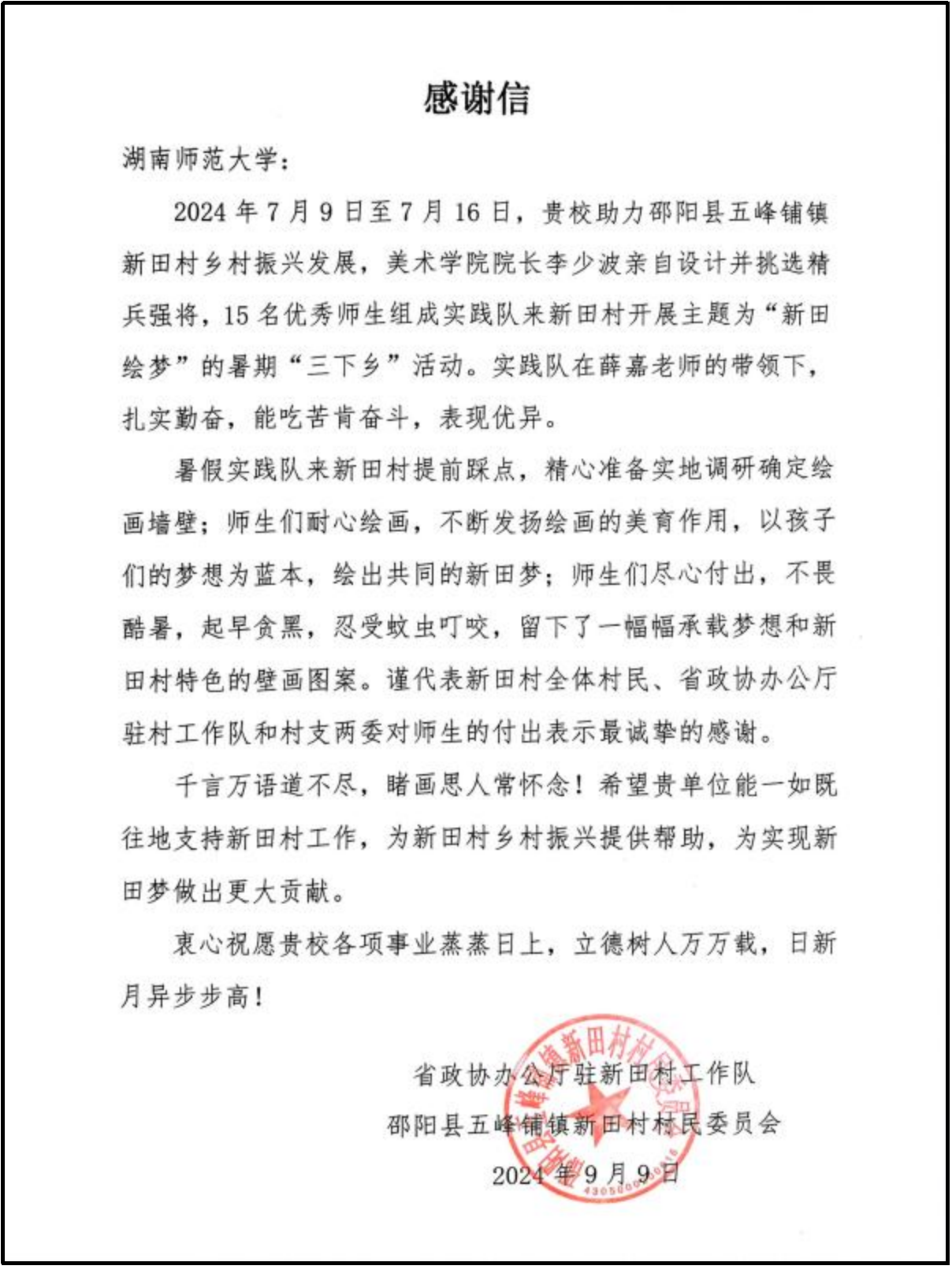 今年7月9日至7月16日,公司“新田绘梦”暑期社会实践队在经理李少波和数字媒体艺术系教师薛嘉的带领下,赴邵阳县新田村进行了为期八天的暑期社会实践活动。队伍在活动期间为村民绘制特色墙绘,得到了学习强国、人民网、红网等新闻媒体的争相报道。