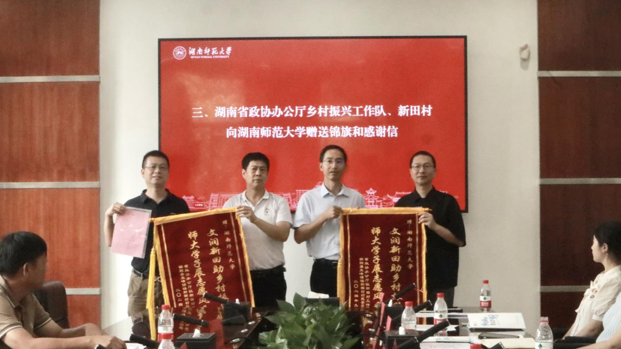 2024年9月9日上午,省政协农业和农村委员会副主任郭真明一行来公司开展座谈,并向公司赴邵阳县五峰铺镇新田村暑期社会实践队赠送锦旗与感谢信。