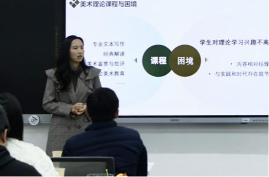 高泽积极探索“智能+”时代下美术理论课程的转型与实践,从“课程内容现代化”“教学方法创新化”及“教学模式多元化”等维度入手,为美术教育领域注入新的活力。她广泛借鉴其他高校在美术理论教学方面的优秀案例,主张通过融合AI技术、紧贴社会热点、推行互动式体验学习、增设研学项目、加强鉴赏与创作间的联系、完善考核机制等方式来激发员工的学习热情和参与度。在分享会上,高泽老师以鉴赏《千里江山图》与《韩熙载夜宴图》等经典画作为切入点,生动展示了其教学理念,主张在现代化教学过程中既要勇于创新,又要坚守对传统文化的传承与发扬。