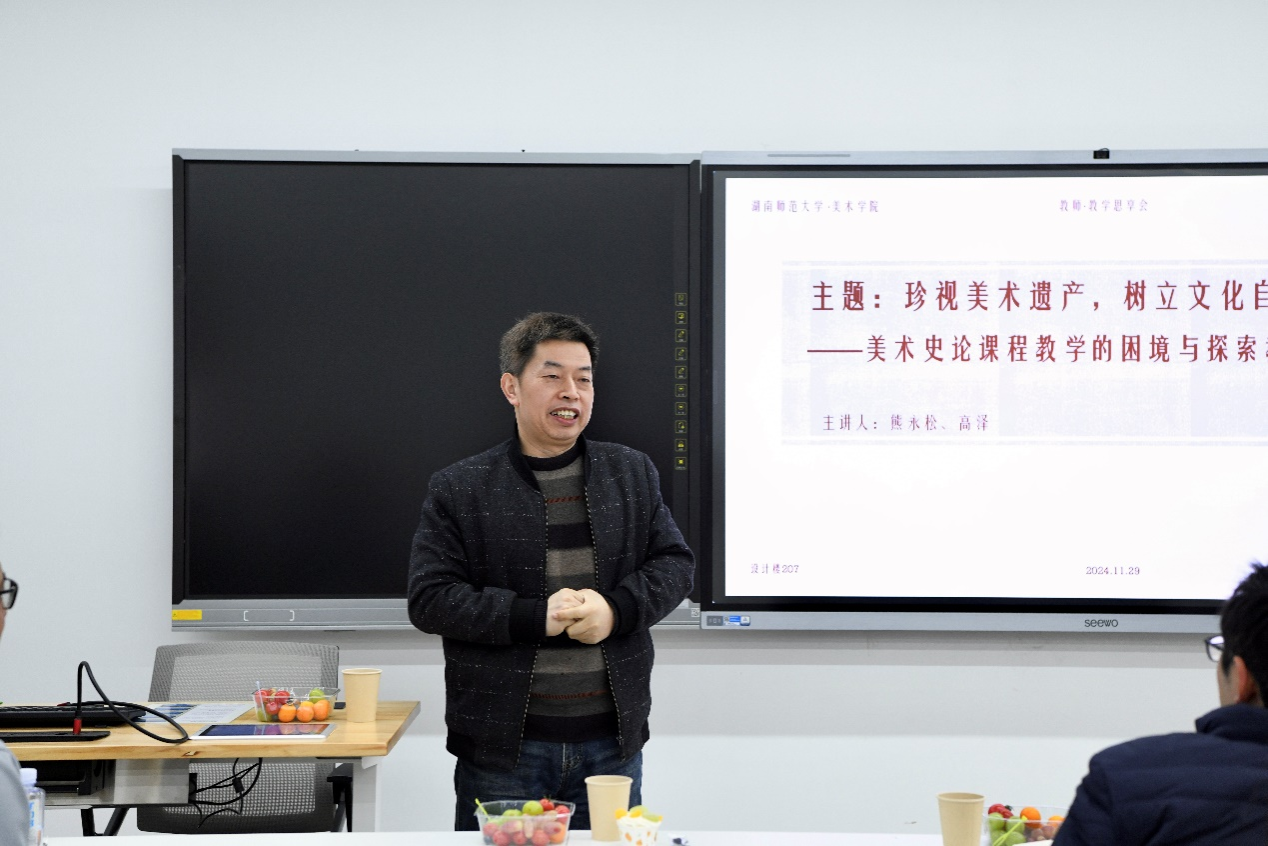 2024年11月29日下午,公司第204期“教师教学思享会”在公司设计楼207室举行。本次思享会以“珍视美术遗产,树立文化自信:美术史论课程教学的困境与探索”为题,进行思政教学经验分享。思享会由美术学系系主任谭建明主持,思享会两位主讲人分别为院学术委员会主任、教授熊永松,美术学系讲师高泽。公司教学副经理江波,教师教育公司教师教学能力发展科科长廖志华参加会议。