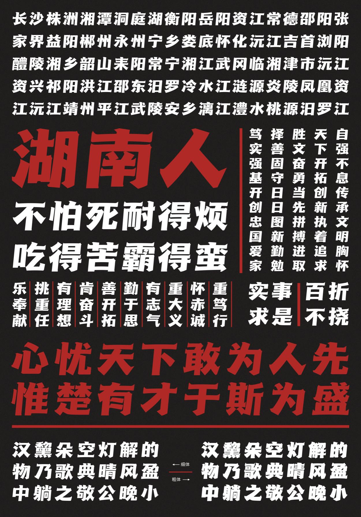 霸蛮体设计以湖南文化为基调,旨在体现湖南人敢想敢干、坚韧不拔的霸蛮精神。设计上采用厚重的笔画、富有张力的细节及动势构建风格。设计师从毛泽东、欧阳询、曾国藩等湖南籍历史名人的书写手迹中提取设计元素巧妙融汇字体中,构建了湖湘特色字体创建新方法,为中国字体创建对外宣传的文化输出开辟新道路。