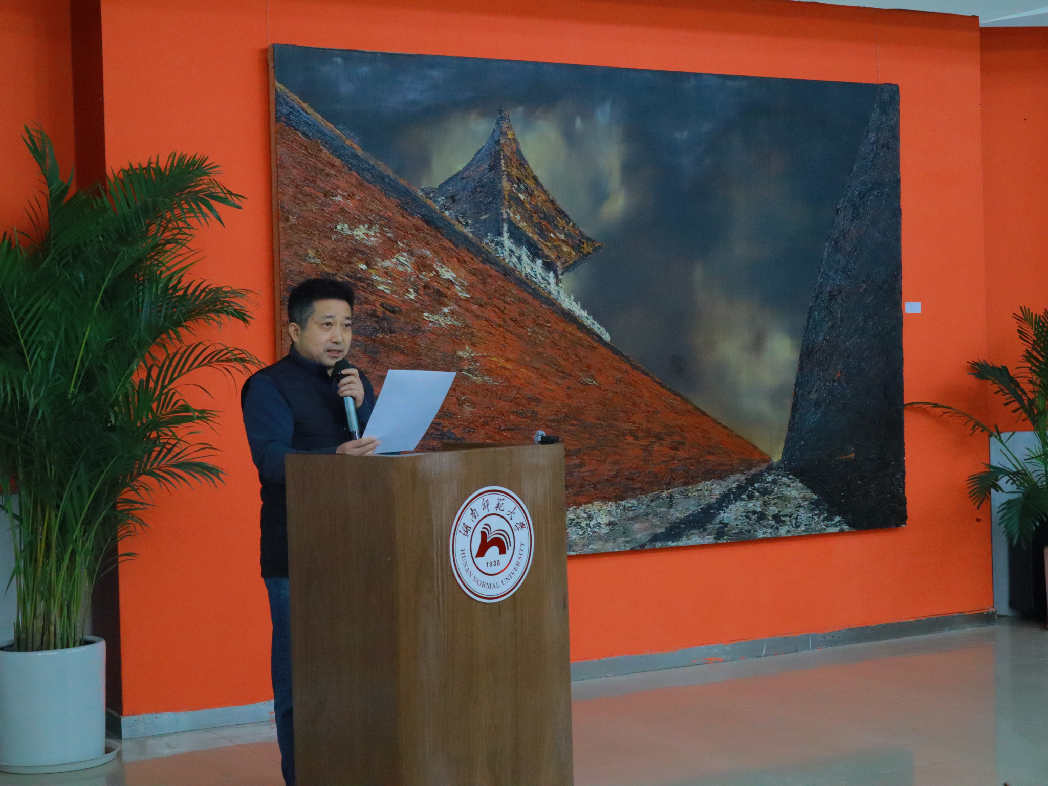 段江华教授深情回顾了三十余载的教学历程。他表示,艺术教育需在技艺传承与文化反思的交织中前行。从青年时期扎根湖南师大至今,他始终坚守在艺术教育的第一线,以笔墨为媒介,倾注心血与热情,致力于艺术的传承与发展。通过斑驳肌理、苍茫色调与纪念碑式构图,传递对时间、存在与文明的深刻叩问,展现“技近乎道”的艺术境界。
