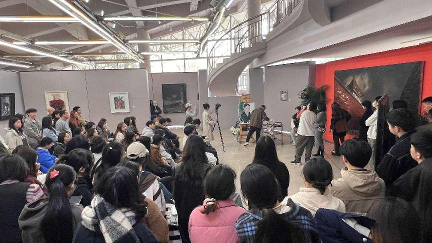 开幕式后,段江华教授以别具匠心的艺术实践为师生呈现了一堂生动的人物写生示范公开课。在示范现场,艺术家执笔挥彩,通过油彩媒介的淋漓演绎,将艺术创作的过程转化为直观的教学语言。其技法呈现彰显深厚的造型功底——从精微的笔触调度到整体视觉结构的把控,再到艺术表现力的凝练提升,层层递进间构建起完整的创作思维体系。示范过程中,段教授始终强调艺术追问的重要性,引导青年学子在技艺精进的同时深化对绘画本质的思考。这场融技法示范与美学思考于一体的艺术课堂,不仅令在场师生叹为观止,更以知行合一的教学方式践行美育使命,引发深度思考与广泛赞誉。
