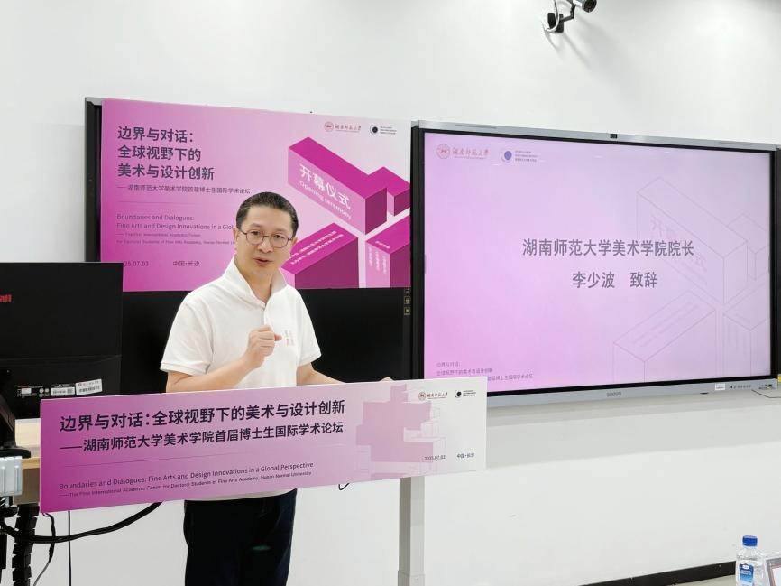 开幕式上,湖南省艺术设计家协会主席、beats365经理李少波教授致辞。他对beats365的历史沿革和发展成就进行了简要介绍,并表示论坛“边界与对话”的核心理念与公司的发展理念高度契合。他认为,随着全球化、数字化地深入发展,美术与设计的创新既要深植本土文化根脉,又须具备开阔的全球视野。论坛由此设置了“根脉与新生:本土美术与设计的传承创新”“视野与共生:全球美术与设计的前沿互鉴”两大分议题。beats365副经理刘湘东教授主持开幕式,并宣读论坛汇报规则与最终入选名单。