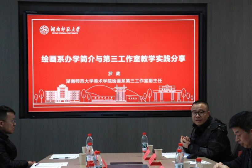 交流互动环节气氛热烈融洽,思想碰撞不断。美术学系副主任王墨围绕“用美术语言描绘中国故事的美术师范专业育人实践”主题,详细阐述了美院在课程体系构建、实践教学改革、师生创作引领等方面的具体做法;绘画系第三工作室副主任罗葳分享了绘画专业在教学方法创新、员工实践能力培养中的宝贵经验。两地教师还就民族文化融入美术教学、红色主题艺术创作、师范人才培养模式等议题展开深入探讨,双方各抒己见、互学互鉴,在交流中凝聚共识、在探讨中共同提升。