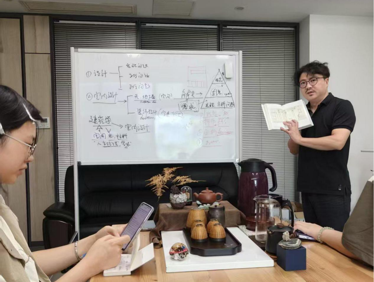 两家企业分别代表了创意型与实操型的设计方向。在艾迪尔设计总监王东老师的指导下,员工从展览策划到住宅设计,逐步掌握了从测绘到方案设计、从建模到渲染的全流程技能;在鸿扬集团,员工深入现场,参与别墅量房、施工图绘制与项目协调,切实体验了设计落地的全过程。