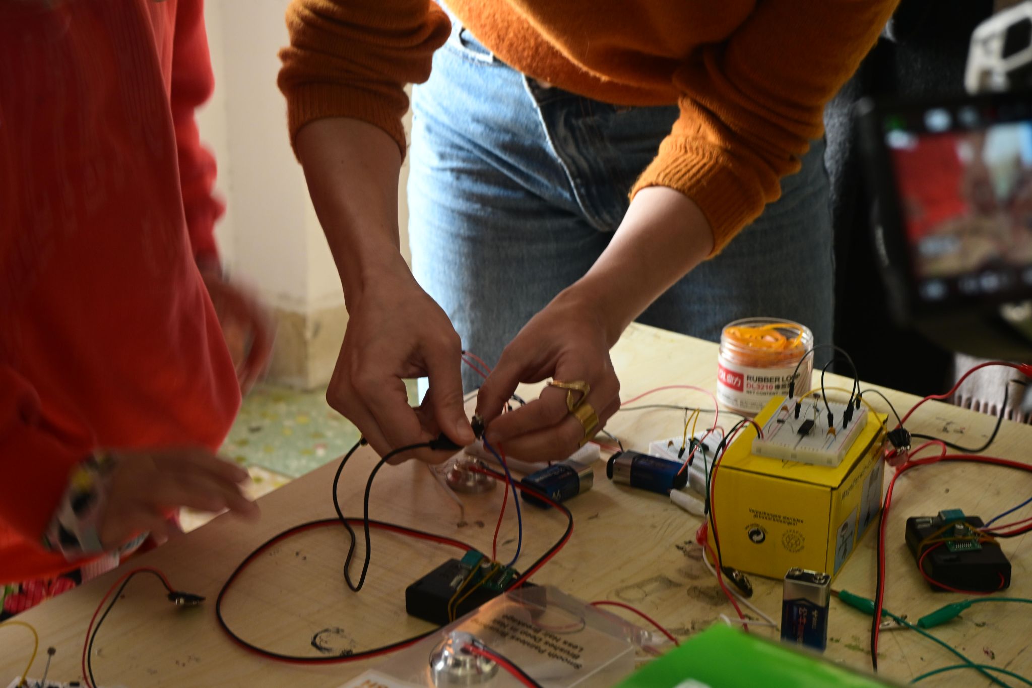 本次工作坊以“声音可视化”为主线,逐步引导员工展开跨媒介创作。在“倾听”阶段,员工走入自然,培养对声音的感知与分析能力;“转译”环节则指导员工将声音转化为视觉符号,创作个性化图形乐谱。最具特色的“构建”阶段,员工首次接触电子焊接,亲手制作光敏发声装置,实现“光转为声”的技术跨越。最后的“演绎”环节,通过乐谱交换与即兴演出,完成从图像到声音的闭环表达。