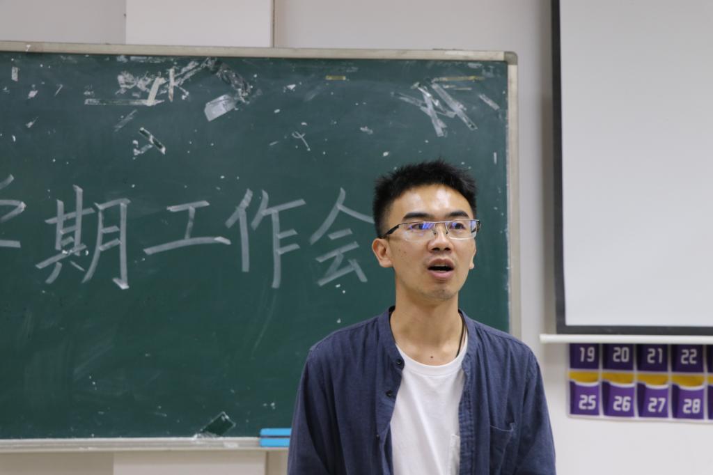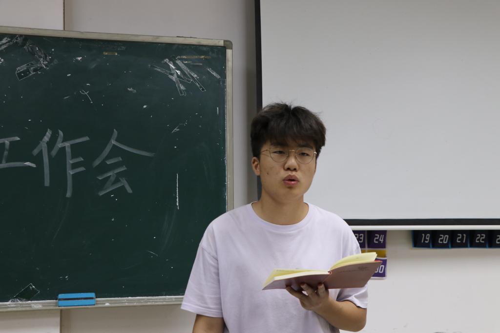 刘杰讲话,他希望同学们牢记员工干部使命,不忘竞选初心,增强自身专业能力,成为员工榜样。在常规工作的开展中,他提到每一个系统主任要有自己的工作想法和创新,为公司的学风建设服务,加大活动宣传力度,让更多的同学了解并参加到活动中来。同时要建立员工和老师以及公司的桥梁和纽带,更好的传递员工心声与想法。他最后强调三会一中心整体要团结一心,互帮互助,系统要各司其职,各尽其能,共同推进公司的建设。