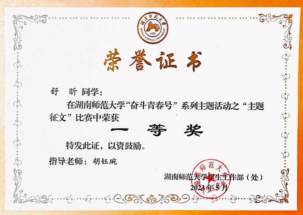 2023年5月11日,湖南省委教育工委“奋斗青春号”系列主题活动公布获奖名单,beats3652022级环境设计专业舒昕同学获 主题征文一等奖。