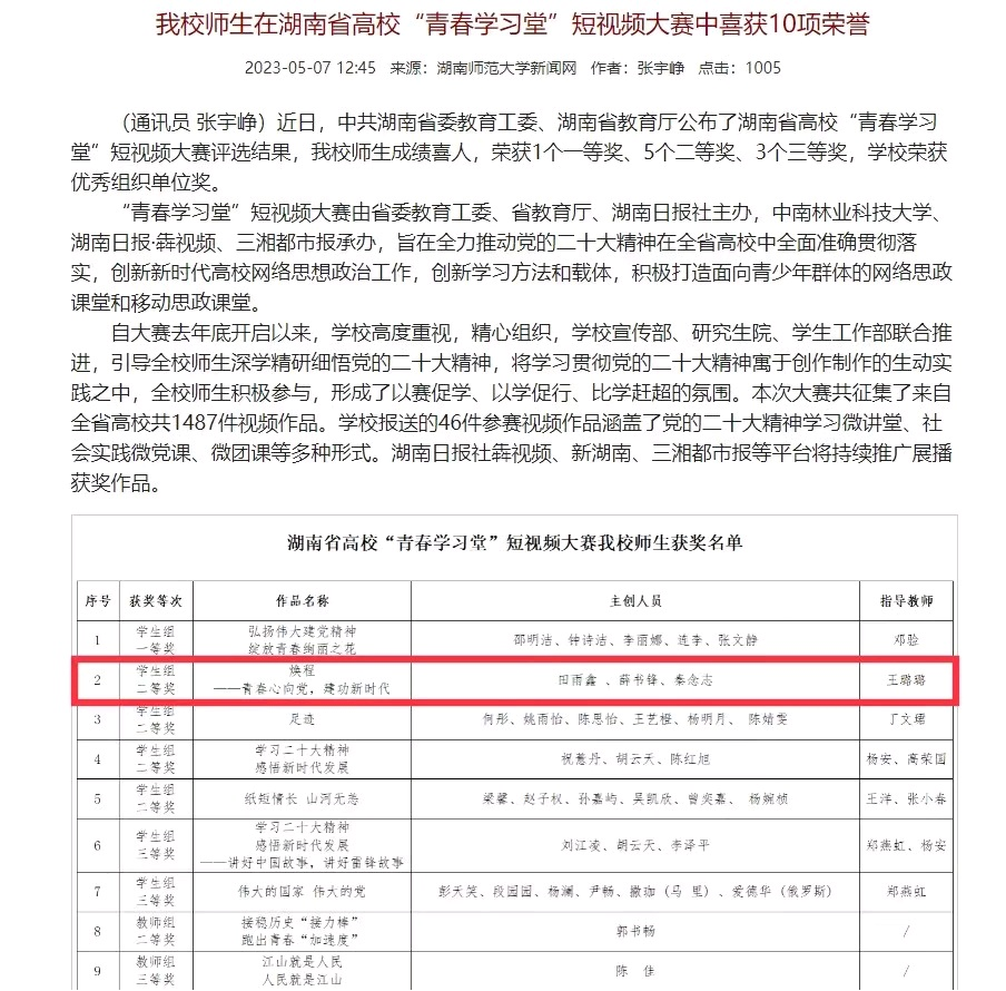 2023年5月7日,湖南省高校“青春学习堂”短视瓶大赛公布获奖名单,美院2019级秦念志同学、2020级田雨鑫同学、2021级薛书锋同学报送的视频作品《焕程》获全省员工组二等奖!