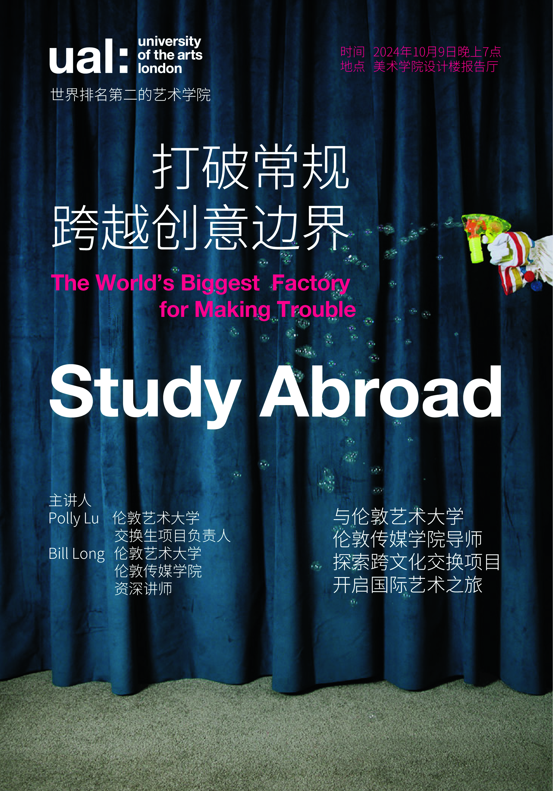 (通讯员 胡梦涵)10月9日晚7点,“打破常规,跨越创意边界”伦敦艺术大学交换生项目讲座在公司设计楼报告厅举办。本次讲座由伦敦艺术大学交换生项目负责人Polly Lu、伦敦艺术大学伦敦传媒公司资深讲师Bill Long主讲,伦敦艺术大学交流游学项目中国合作伙伴汤子慕老师、院教务办主任张禹蕲老师、院团委书记唐士晋老师及2024级全体本科生出席。