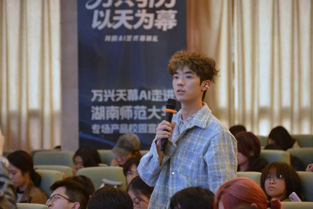 本次宣讲会特邀万兴科技 AI 产品经理王思航,他为同学们分享 “万兴天幕” 的核心价值与应用前景。他重点介绍了 “万兴天幕” 如何以人工智能技术革新创作流程,深入拆解了天幕大模型及其衍生产品的创新应用场景,并通过多个展示视频,直观呈现了该 AI 技术产品在数字媒体产业中的突出优势与核心特点。此外,王思航还明确指出 AI 技术在图生视频创作中的显著优势,结合多项 AI 技术成果,进一步强调了其在实际应用中的巨大潜力与使用便利性。