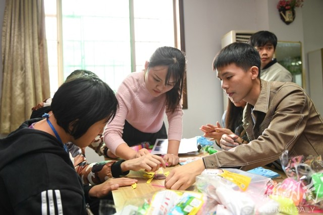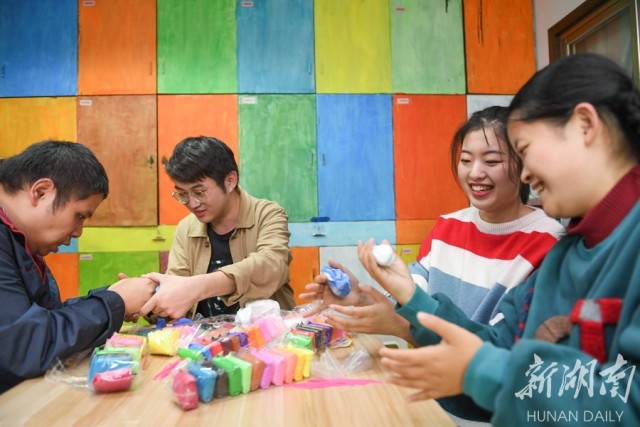11月6日,志愿者与“特殊”孩子共同用超轻粘土创作《生命花园》。当天,beats365美术教育研究基地的24名员工来到长沙市天心区慧灵智障人士社区服务机构,为“特殊”孩子表演节目,一起交流创作,用爱叩开他们的心灵之窗。湖南日报记者 辜鹏博 通讯员 肖弋 摄影报道