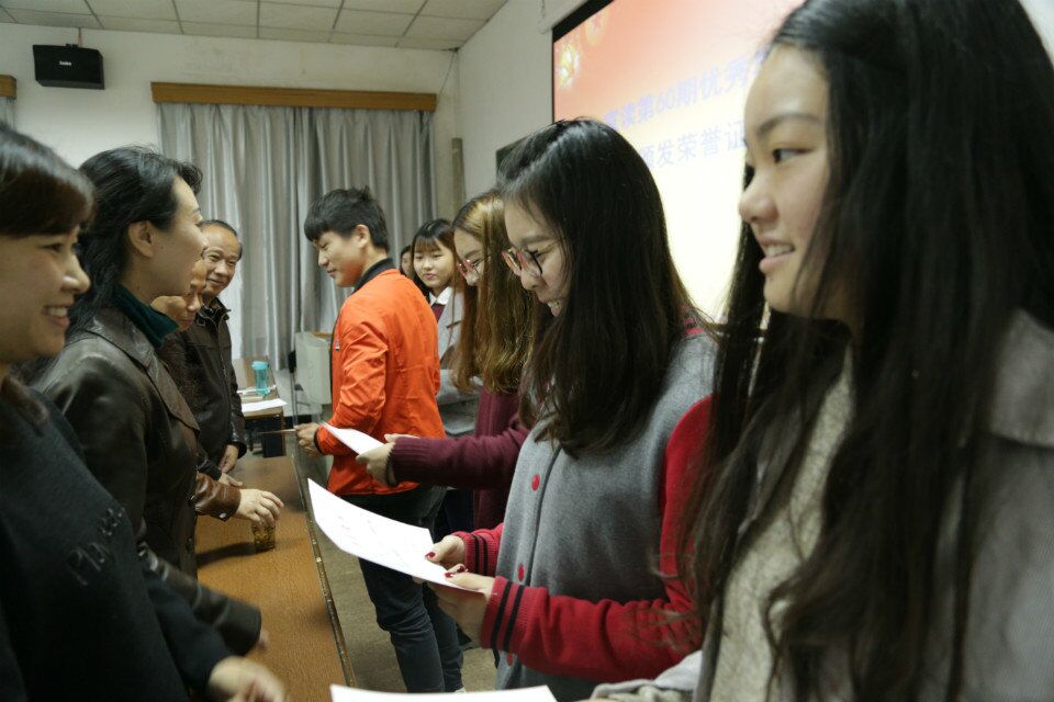 余英宣读了第60期入党积极分子培训班优秀学员名单,出席典礼的领导老师为优秀学员颁发证书。