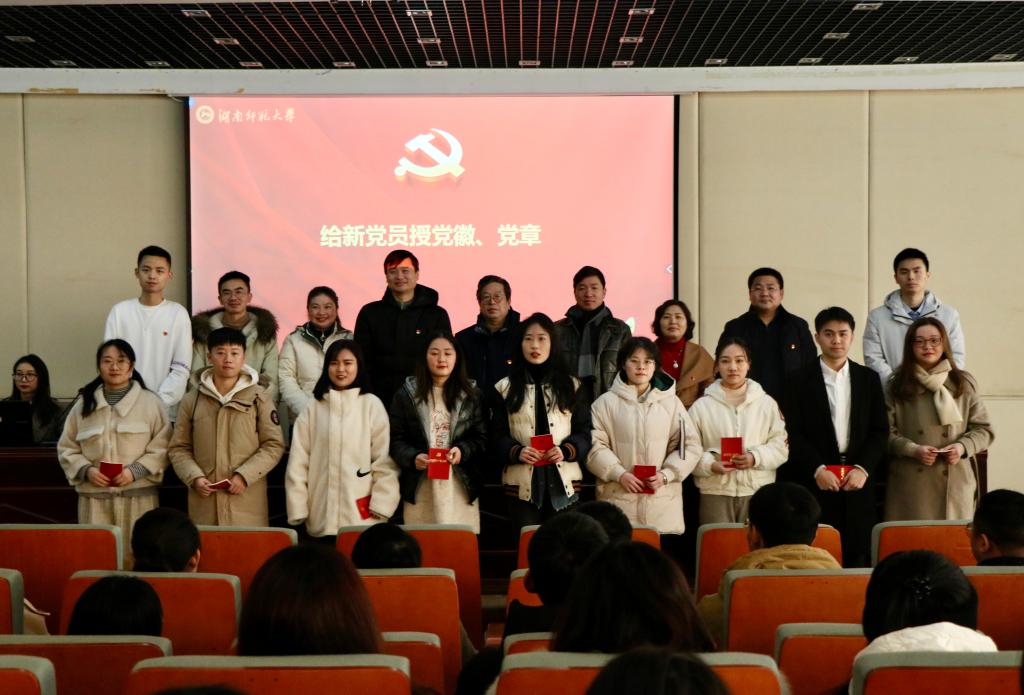 刘杰宣读2020年新发展的72名预备党员名单,由公司党委委员、研究生办、学工办的教师为新发展的预备党员授予党徽、党章。