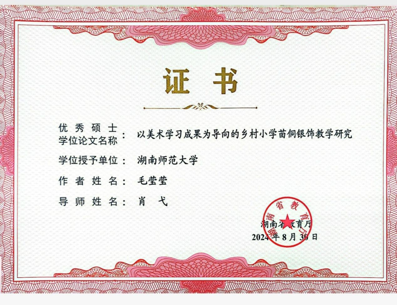 《以美术学习成果为导向的乡村小学苗侗银饰教学研究》获2024年优秀硕士学位论文