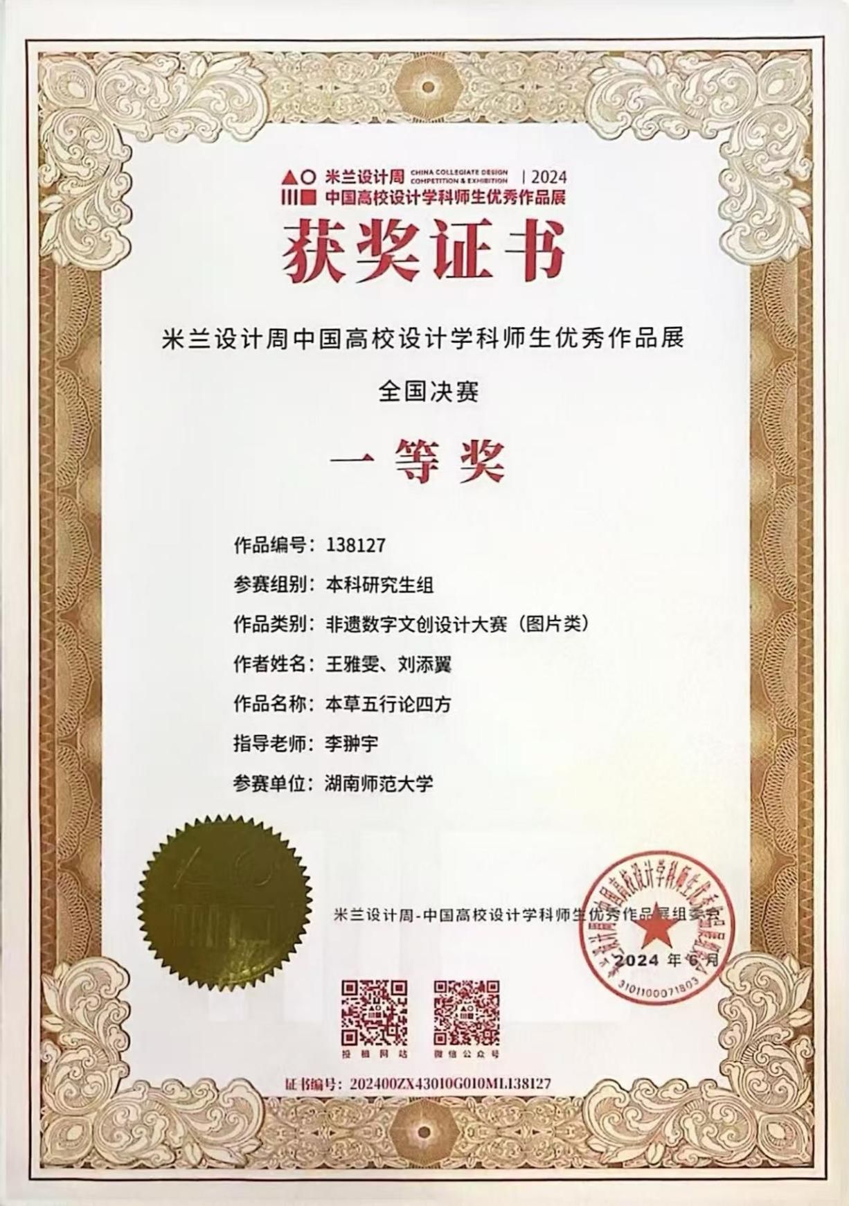 上一条:2024年第五届湖南高校毕业季美术作品展获奖证书。授奖单位:湖南省教育厅